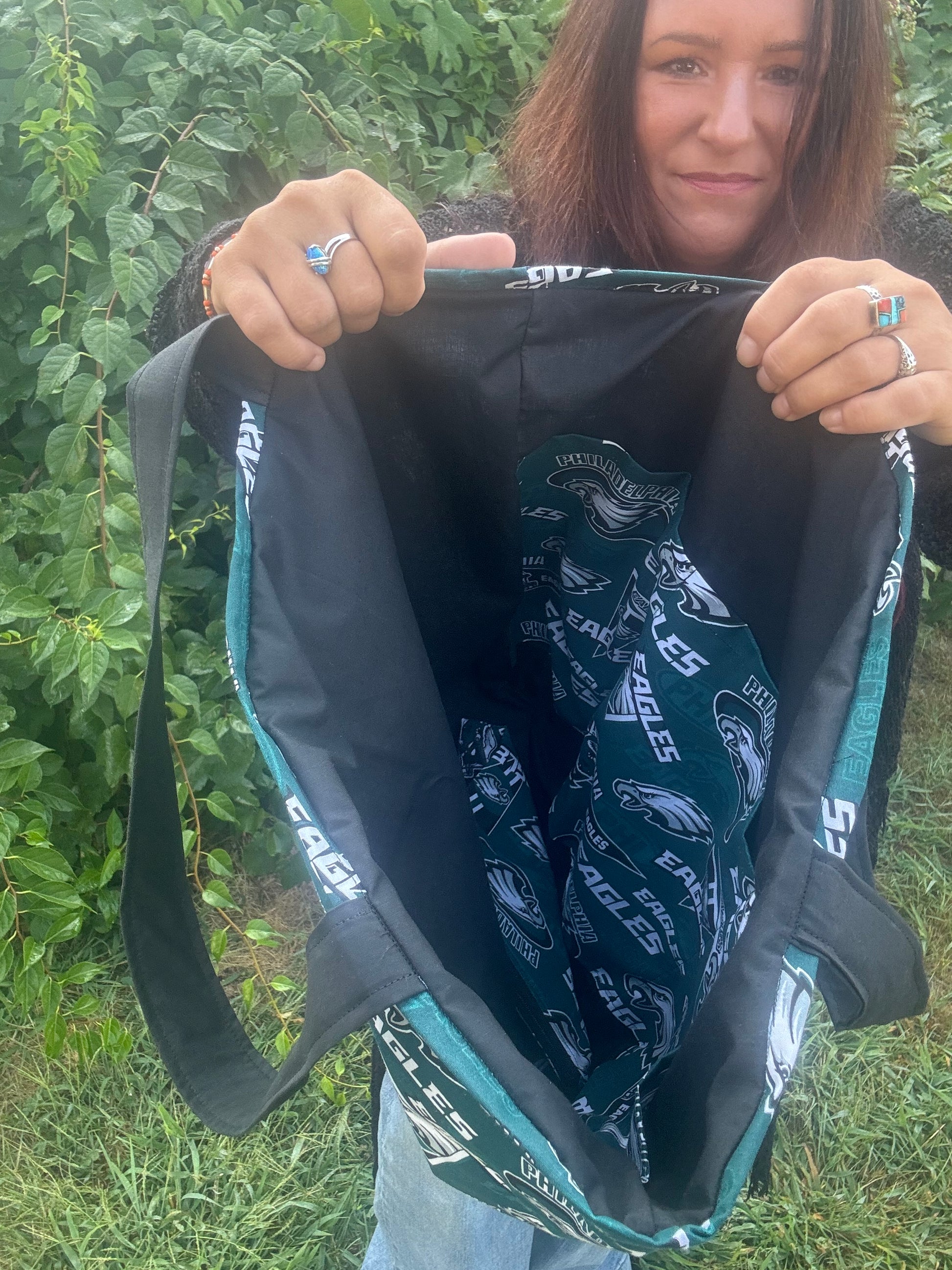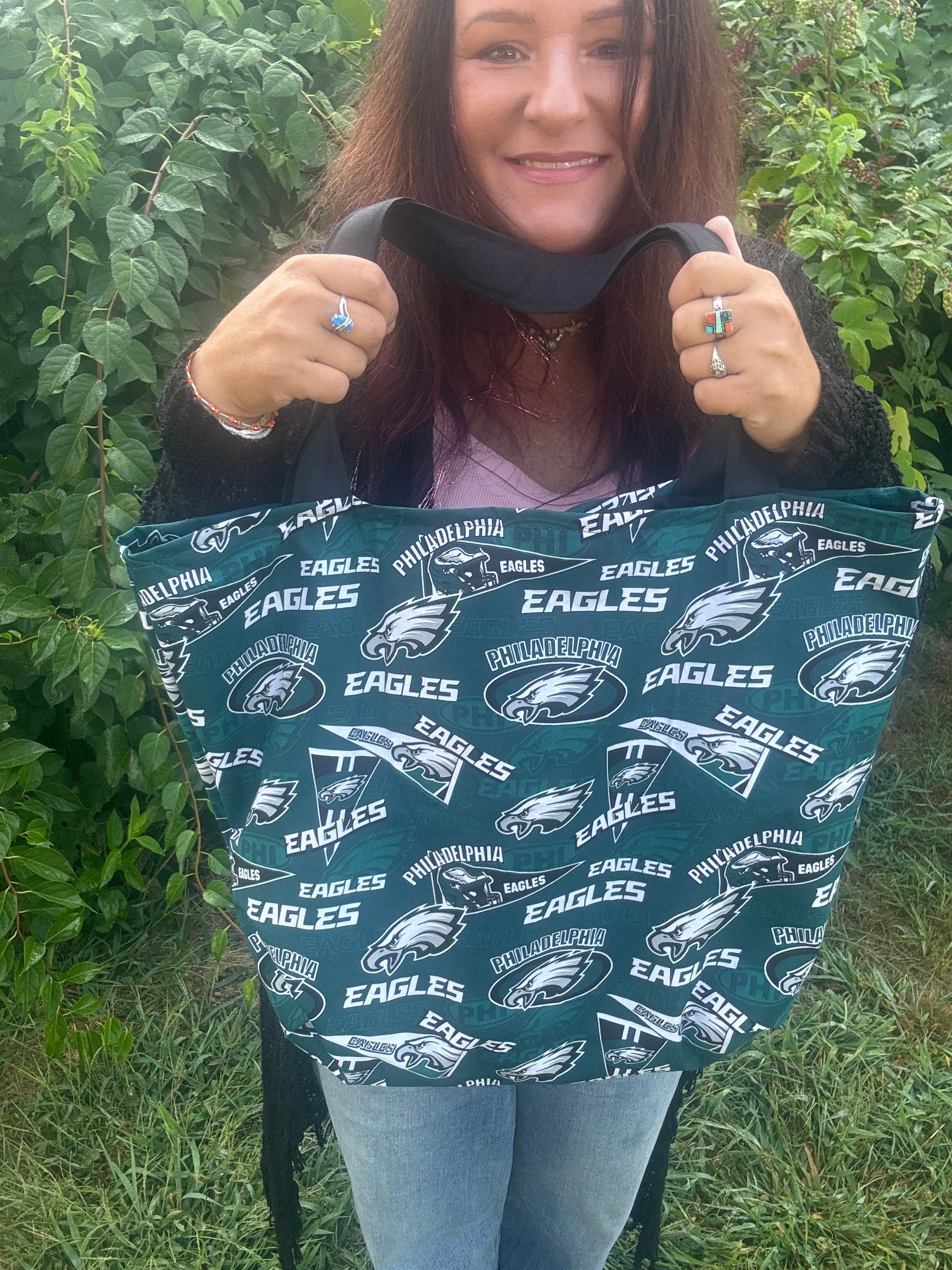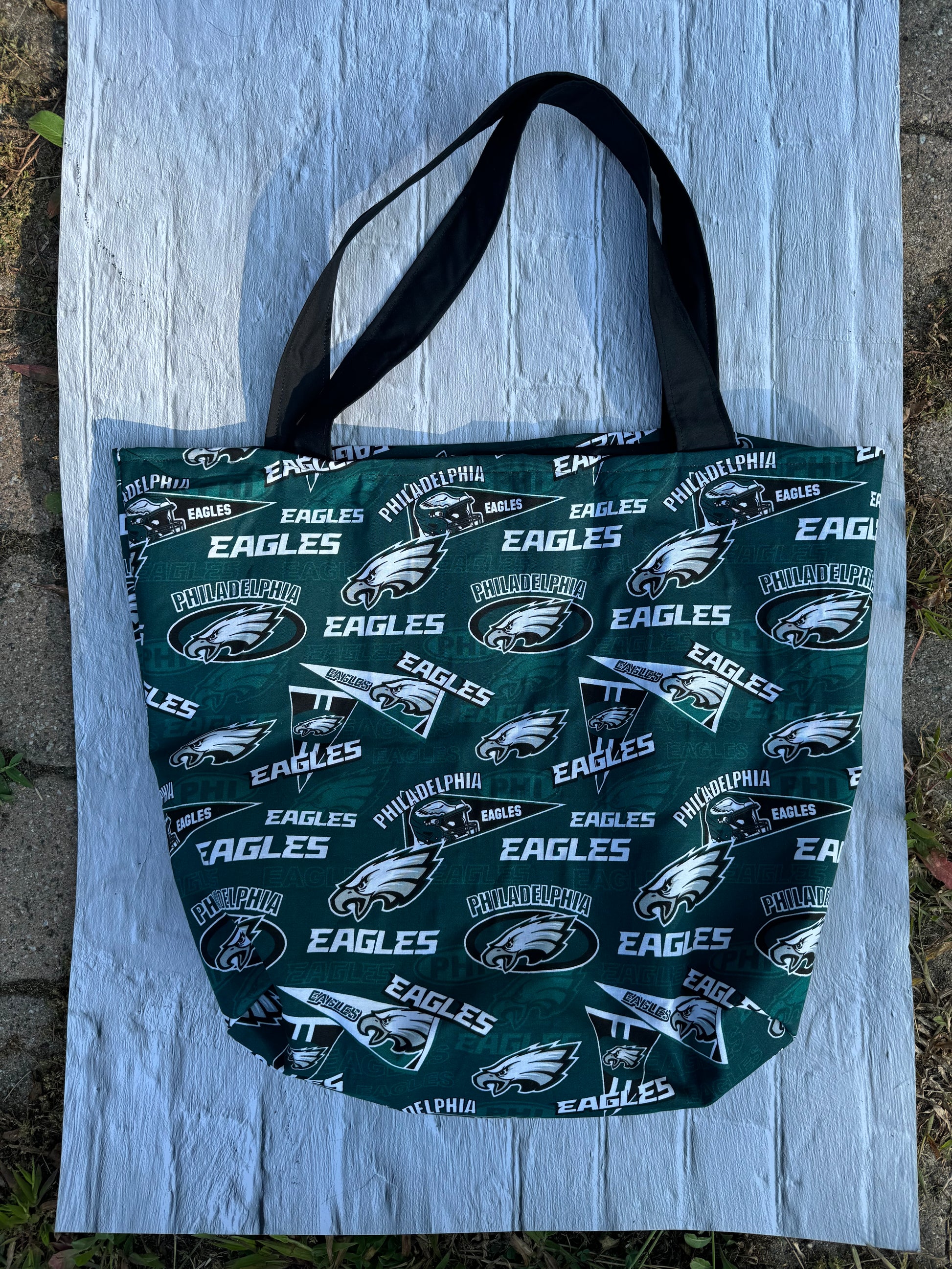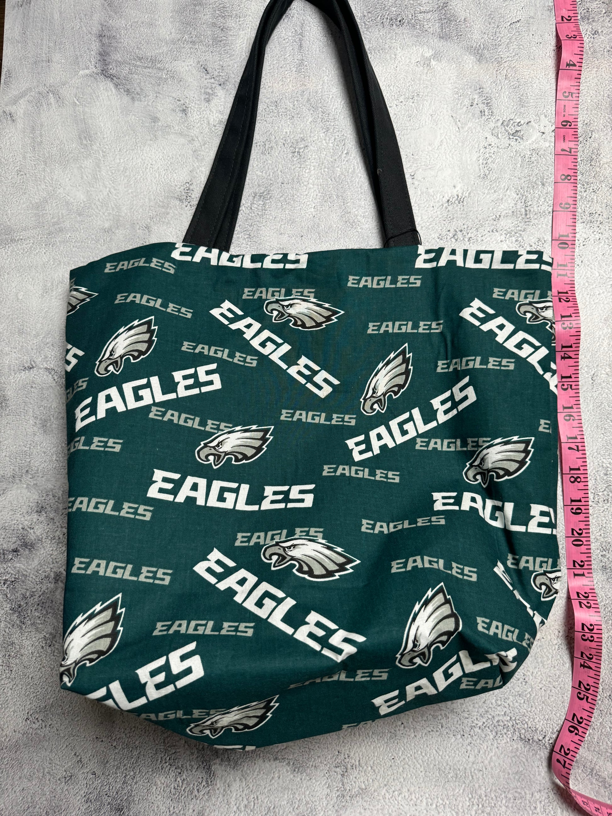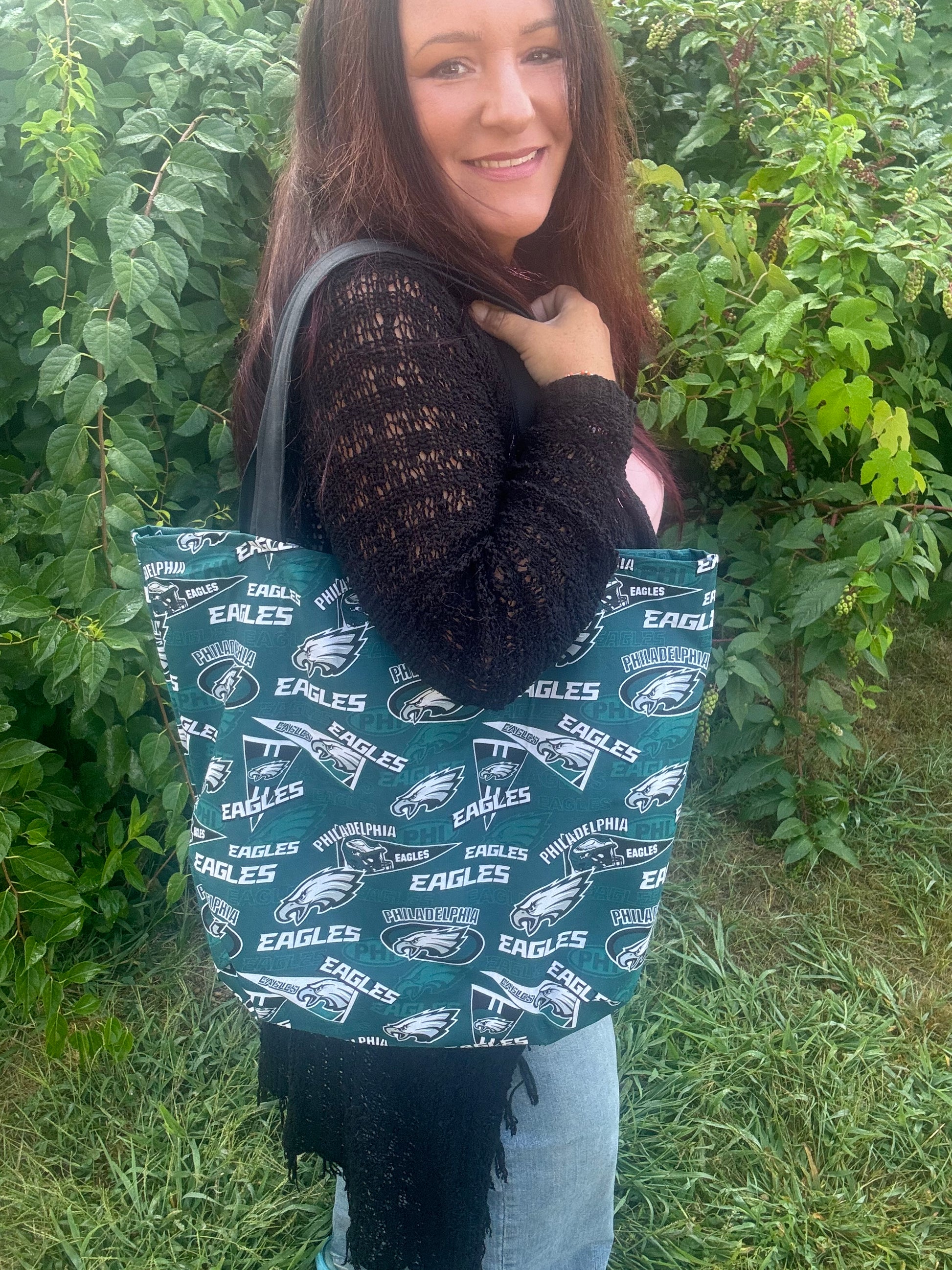 Show off your team spirit with this Eagles-themed tote bag! Fully lined for durability and equipped with three slip pockets, it’s perfect for keeping your belongings organized while on the go. Whether you're heading to the game or running errands, this tote offers a blend of fan pride and everyday convenience.