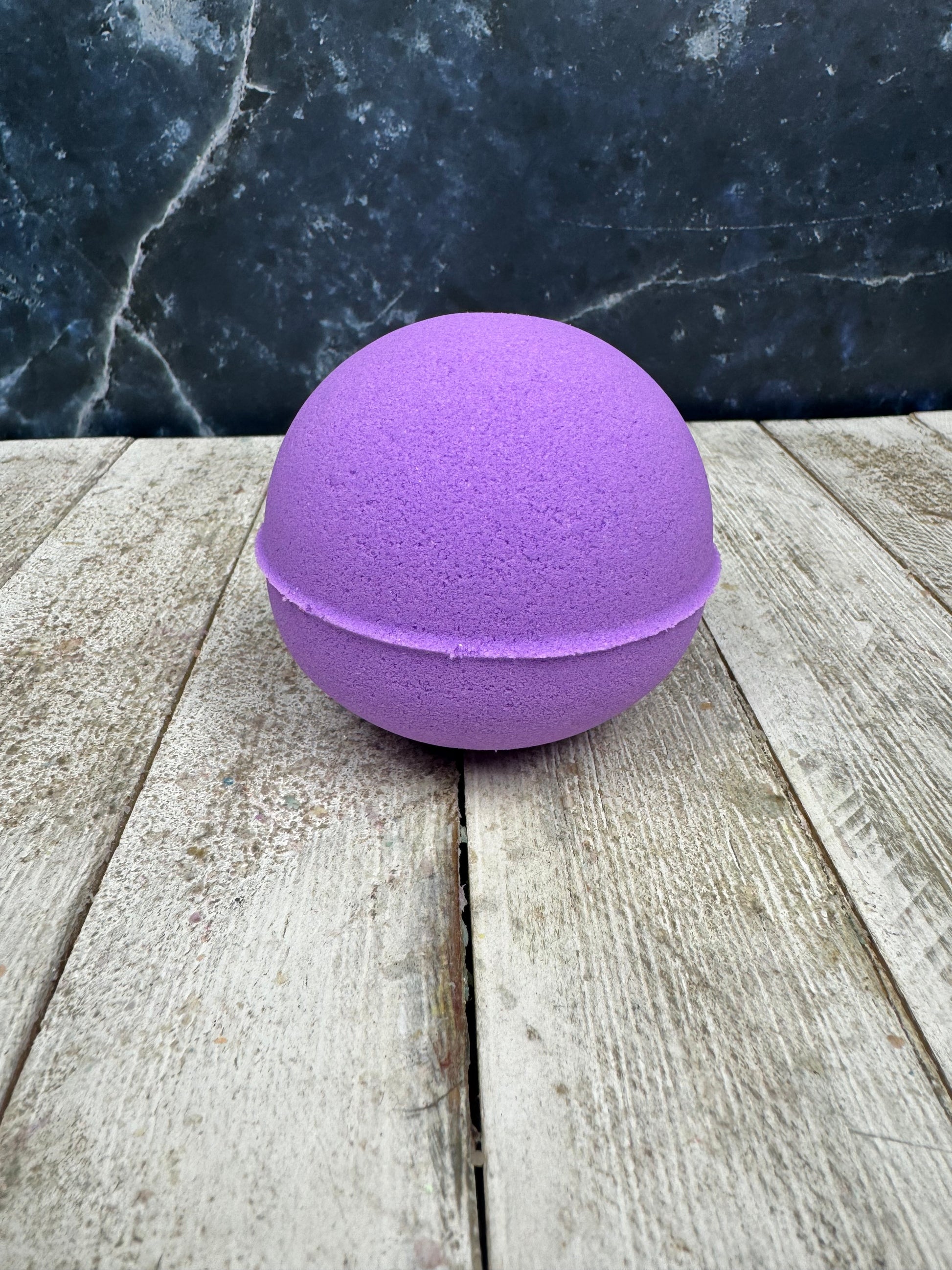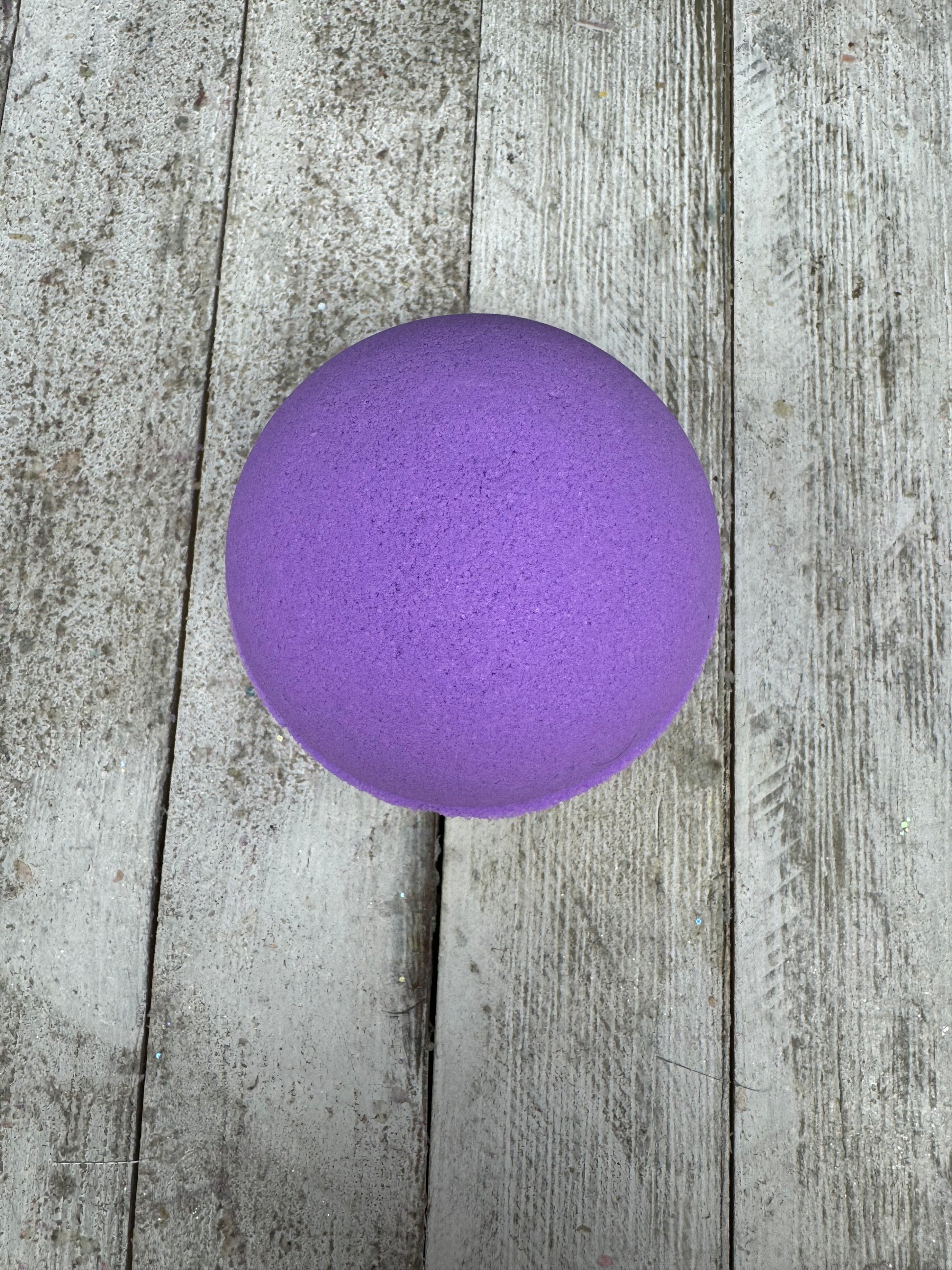 A lavender bath bomb with a purple exterior and a surprise burst of pink inside, shimmering with glitter, offers a luxurious and soothing experience. As it dissolves in the bathwater, it releases a calming lavender aroma while the pink center adds a touch of whimsy and surprise, making every bath a delightful escape.