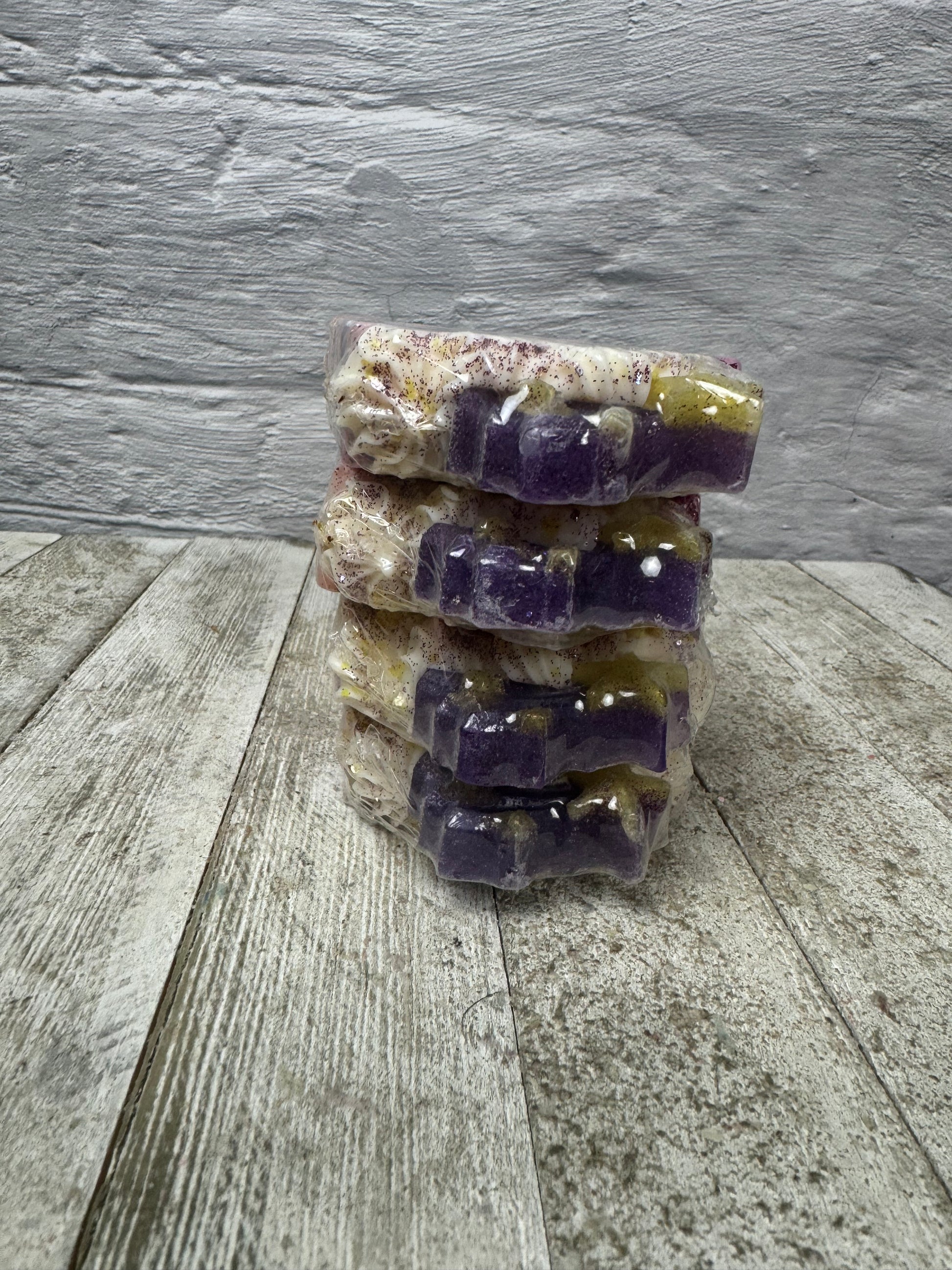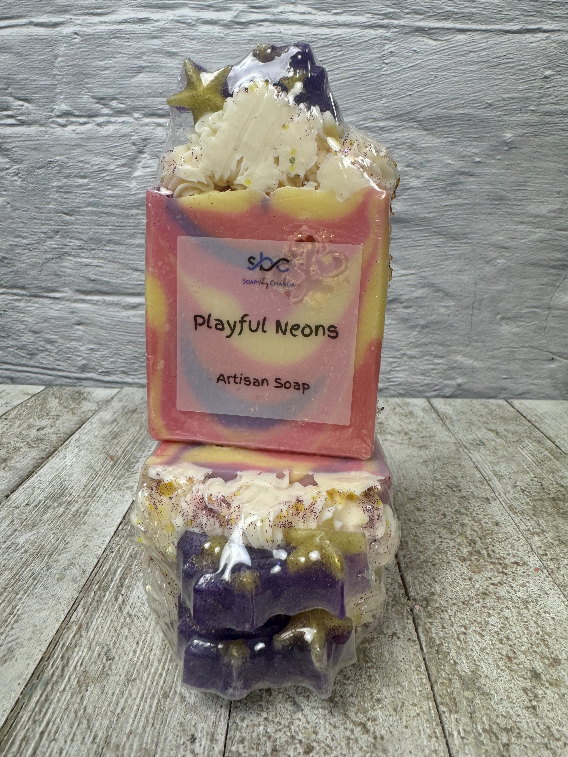 Brighten up your bath time with our Playful Neons Soap! Made with nourishing goat milk, this vibrant soap features a lively swirl of pink, purple, and yellow. Topped with a whimsical shooting star embed, it's a delightful blend of fun and luxury, perfect for adding a splash of color and joy to your daily routine.