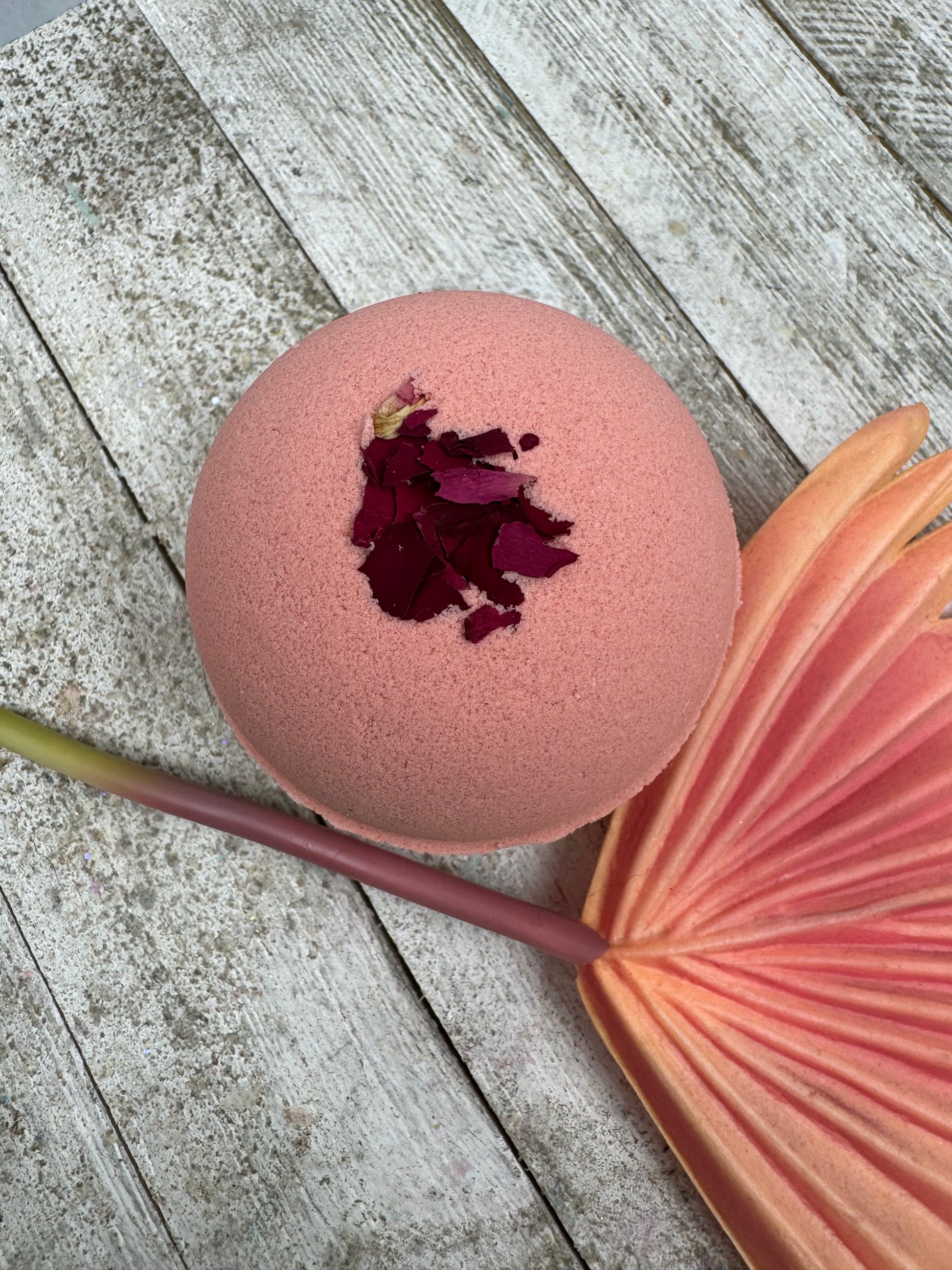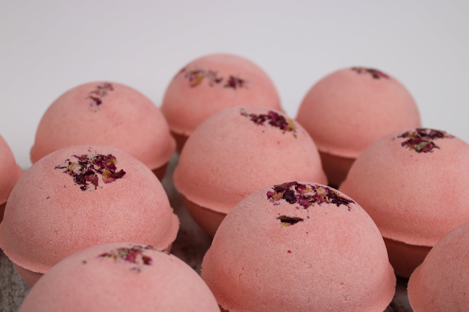 They are made with baking soda, citric acid, cream of tartar, slsa, kaolin clay, corn starch, shea butter, witch hazel, hemp oil infused with lavender, polysorbate 80, fragrance, water, dye, mica, rose petals.