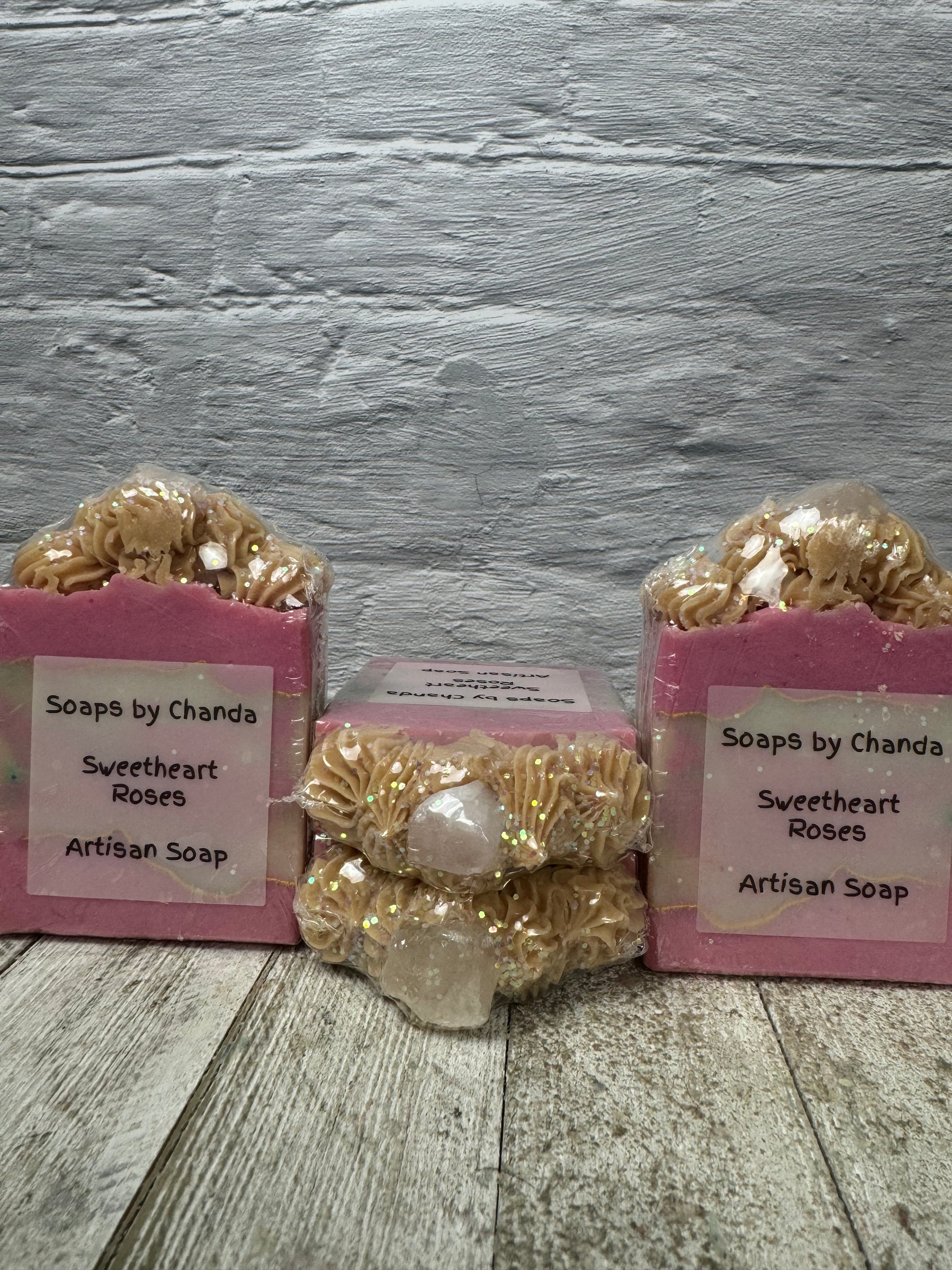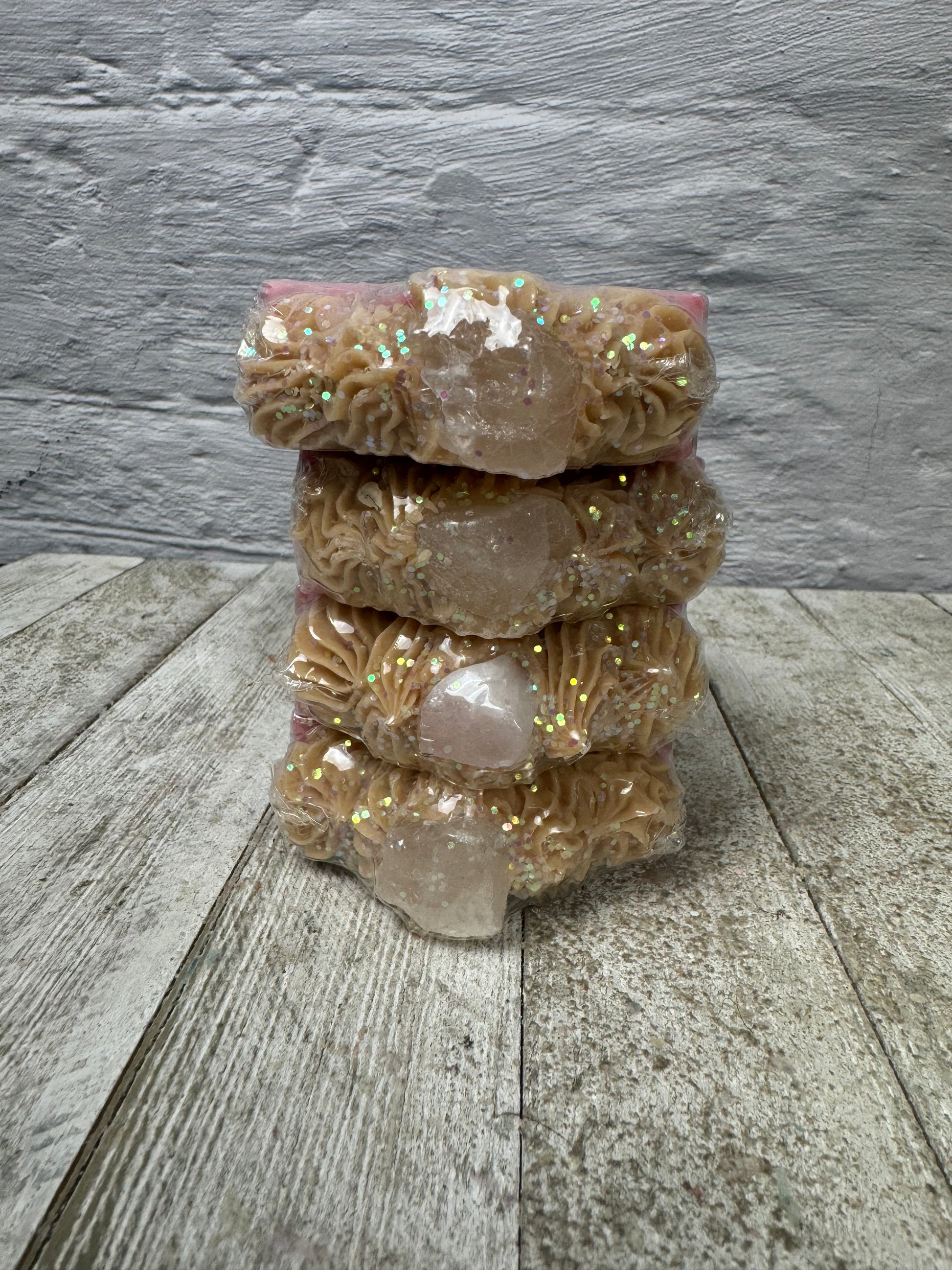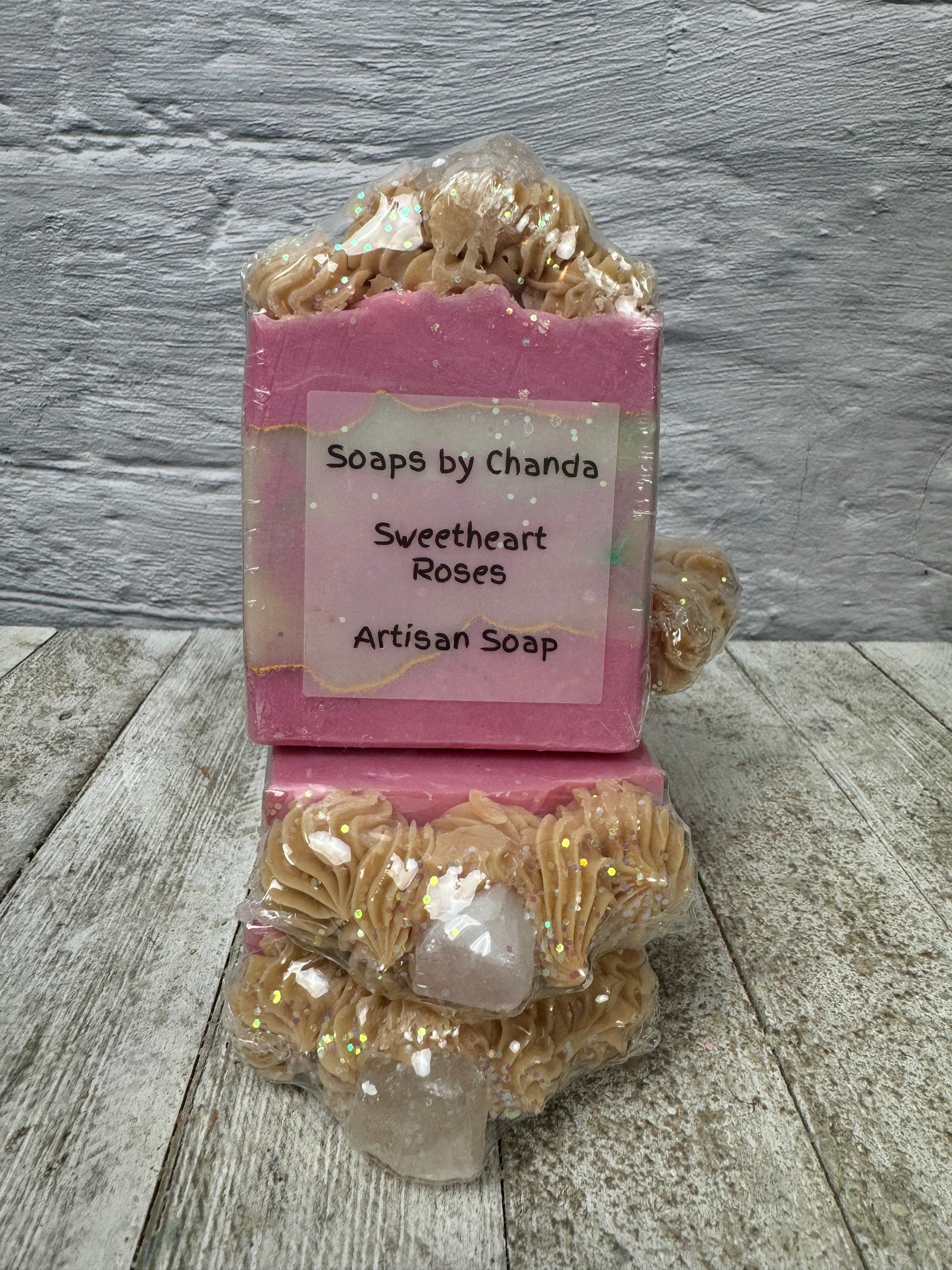 Embrace the romance with our Sweetheart Roses Soap. This luxurious soap showcases delicate pink swirls and intricate piping, crowned with a stunning rose quartz atop. Infused with the essence of love and elegance, it's the perfect way to pamper yourself or a loved one with a touch of timeless beauty.